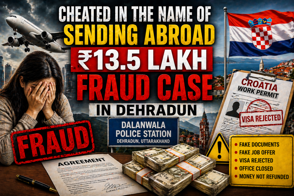 A major Dehradun Immigration Fraud case has surfaced in Dehradun, where a Himachal Pradesh woman alleges she was cheated of ₹13.5 lakh by agents promising Croatia work permits. The accused reportedly used fake job offers and forged documents, leading to visa rejections. Police have registered an FIR and launched an investigation.